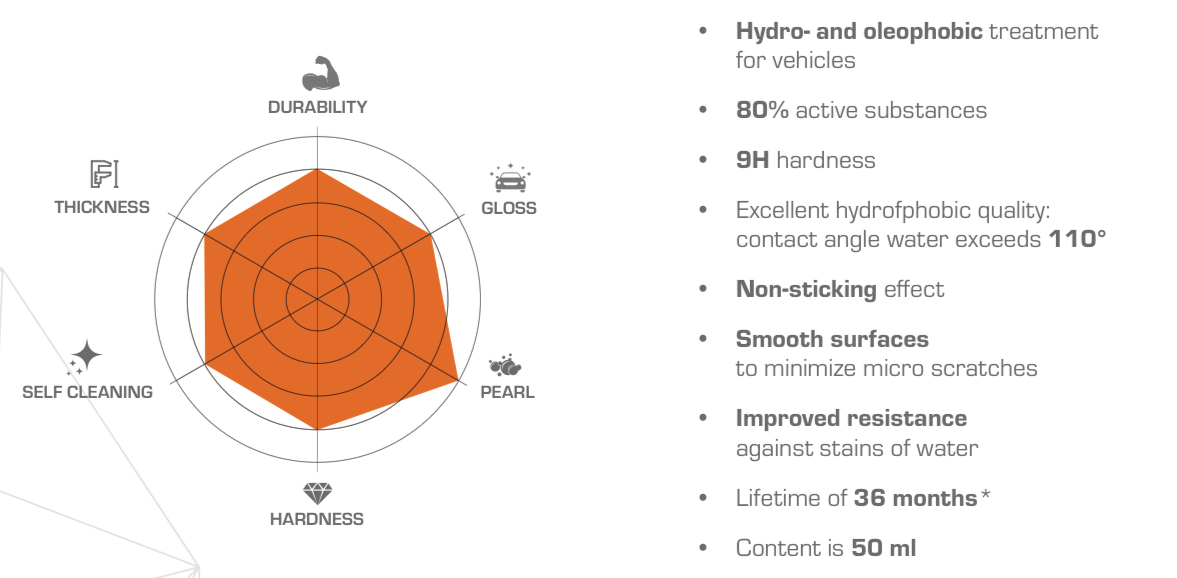 Door de unieke samenstelling maakt Kenotek Camiq de lak krasbestendiger en gemakkelijker te onderhouden. De Coat It is extreem resistent tegen weersinvloeden en diverse chemicaliën. Waar de traditionele waxen en sealants snel aangetast worden door sterke reinigers en mechanische wrijving blijft deze coating optimaal aanwezig. De harde en complexe structuur zorgt ervoor dat de kans op vegen of fijne krasjes minder snel ontstaan. Coating met een bescherming van 3 jaar. Inhoud 50ml Inclusief applicator. Exclusief ontvetter, gebruik hiervoor de Kenotek Pre Coat.